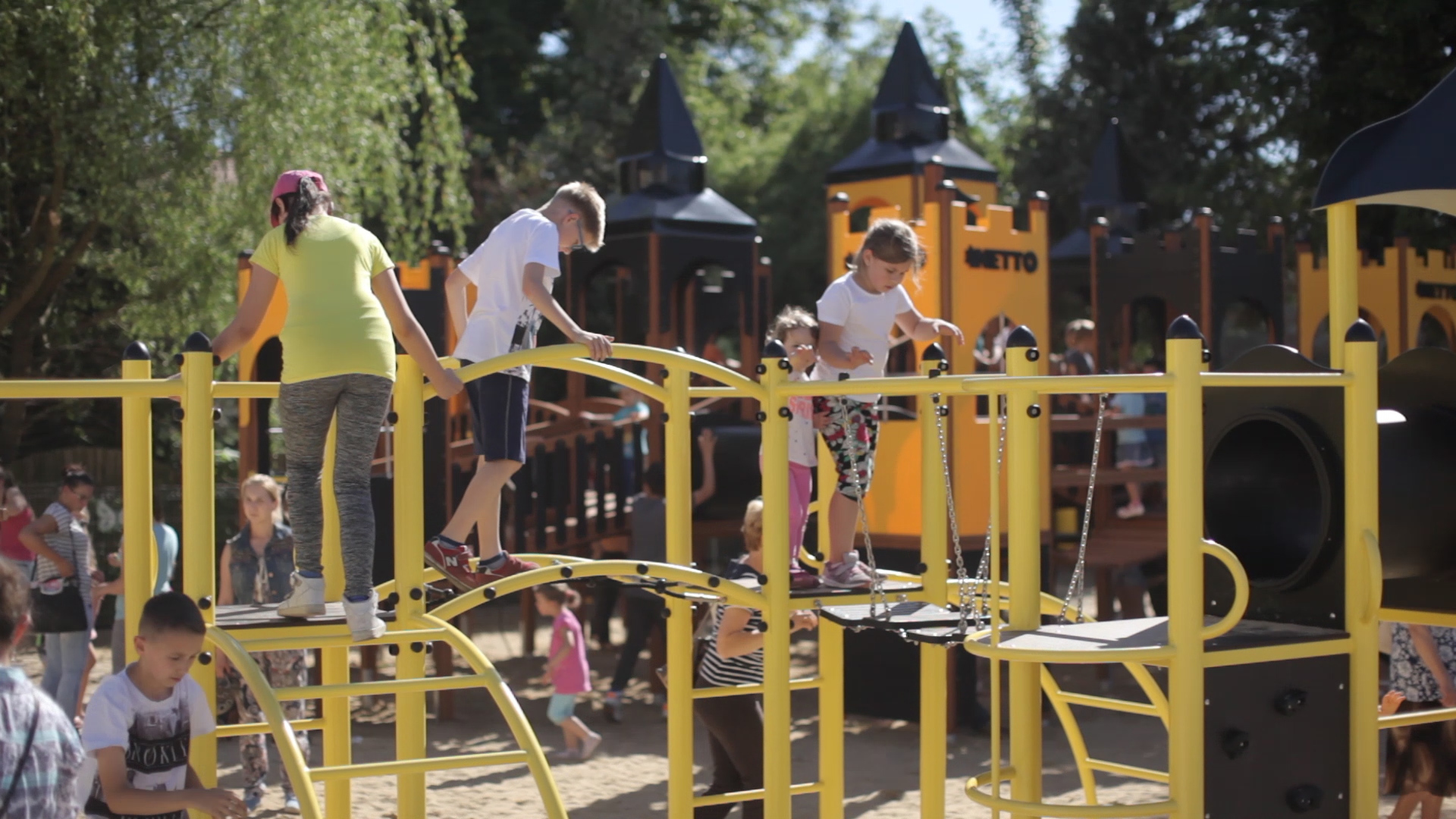 We did everything to make the playground resemble their Danish brand: the metal components were repainted in yellow, and the company's logo hung on the top of the castles' towers. Especially for this occasion we also created a fun market stand and a swing in a shape of Scottie.