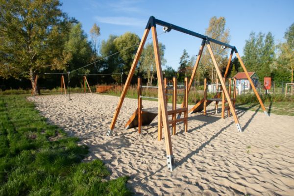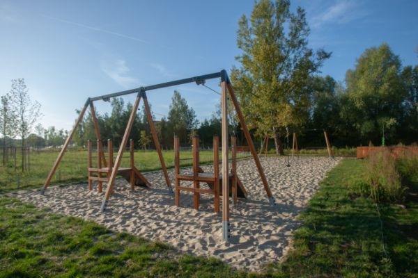 The Double Cableway with Platforms, a standout feature in the Nature line, offers an exhilarating and dynamic playground experience. Spanning an impressive length of 2261 cm and width of 757 cm, this expansive setup is a significant attraction for any outdoor area. With a height of 365(+/-5) cm, it stands as a majestic structure, beckoning children aged 5 and older to embark on an adventure.