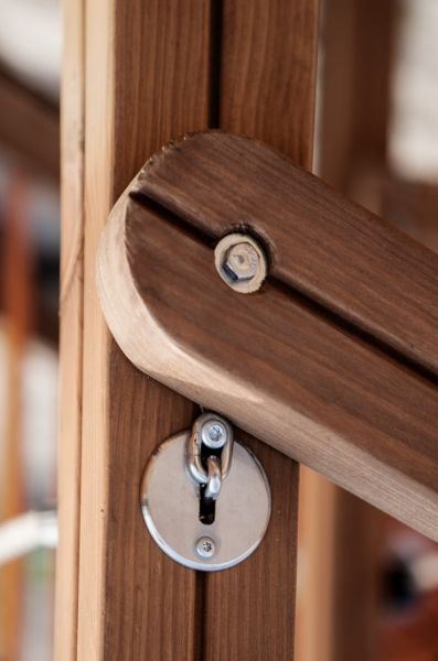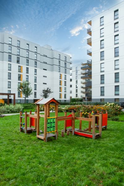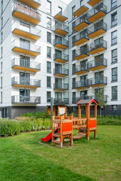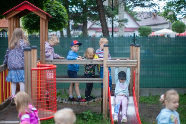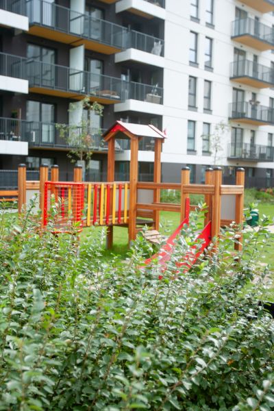 The construction of the device is made of durable and resilient larch wood. The sliding surface is made of stainless steel, and the sides are made of HDPE material. The roof and platform floor are made of waterproof anti-slip plywood, ensuring safety for children and durability for the entire structure. Colorful metal elements such as the balcony and rungs are made of powder-coated steel. The walls of the "Warownia" are made of metal sheets coated with plastisol.