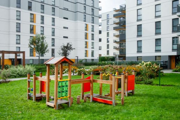 The fortress is a multi-functional playhouse with a tower and slide designed for outdoor playgrounds. The device is intended for younger children who have reached one year of age, making it perfect for preschool or nursery playgrounds. It will also work well as an addition to a playground used by children of various age groups, such as in a city park. The fortress includes a roofed tower, a wooden bridge, a platform, a wooden bridge, a balcony, and a slide. The roof over the tower allows children to seek shelter from the sun, wind, or light rain.