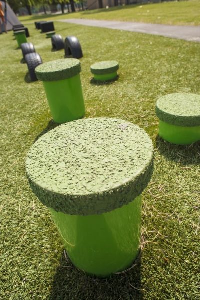 These green-colored pegs are perfect for creating a custom obstacle course, either in a backyard, schoolyard, residential area, or park. Their natural and urban-friendly color scheme blends seamlessly into various environments, making them a suitable choice for any outdoor setting.