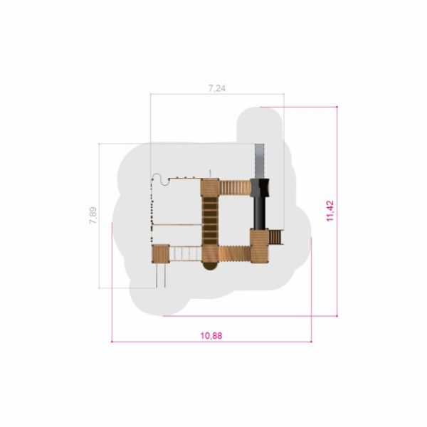 The King-Kong Nature II castle proudly stands with a sprawling width of 724 cm and a length of 789 cm. It soars to a towering height of 323 cm, establishing an imposing presence that immediately excites and entices. Its design factors in the utmost safety with a critical falling height of 250 cm and a well-demarcated safety zone spanning 1088 cm by 1142 cm. The playground structure mandates a falling surface to ensure the safety and protection of its little explorers.