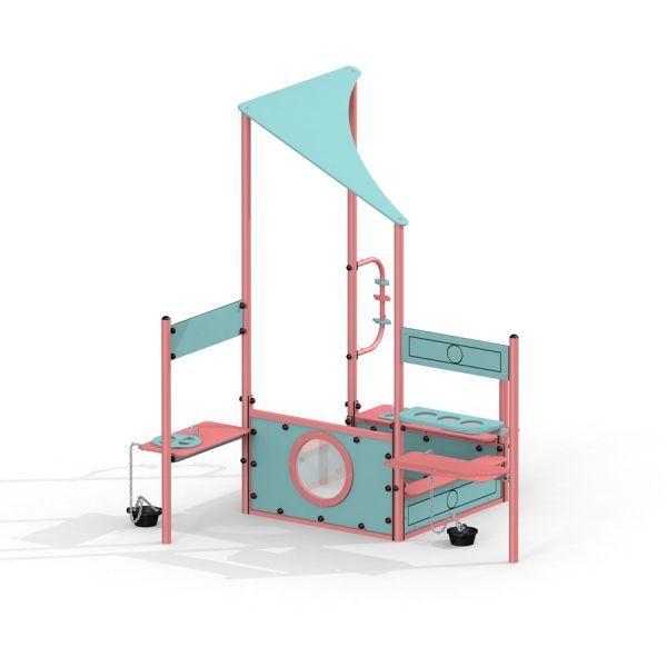 Designed as a covered sandbox with a slanted roof, the Pluto Single Playhouse features interactive play panels and two rubber buckets for added play possibilities. The structure is made of powder-coated steel with colorful walls and HDPE panels, invoking a sense of space travel and a futuristic aesthetic. The playhouse boasts a porthole on one of the sandbox walls, reminiscent of a spaceship's window, enhancing the space-themed experience.
