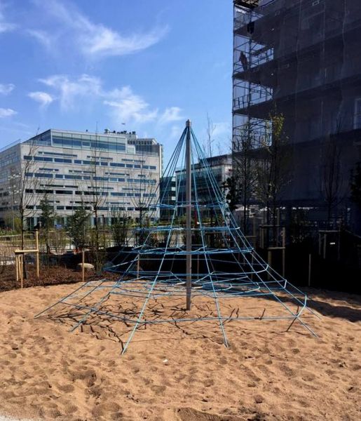 Designed to meet safety standards, the climbing net requires a safety zone of 901x820 cm and a critical falling height of 90 cm, ensuring a secure environment for the young adventurers. The use of high-quality materials such as stainless steel, galvanized steel, and reinforced polypropylene ropes in its construction not only ensures durability but also adds to its futuristic and modern appeal.