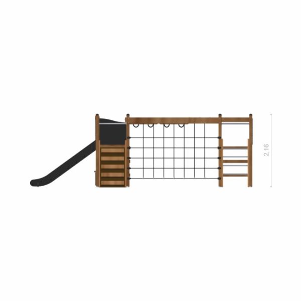 Crafted from resilient larch wood, the structure boasts stainless steel and galvanized steel components, complemented by reinforced PP-Polypropylene ropes and anti-slip, waterproof plywood elements. Stainless steel chains and HDPE materials further enhance the durability and safety of the structure. The rounded edges of all components are a thoughtful design feature, prioritizing the safety and comfort of young adventurers.