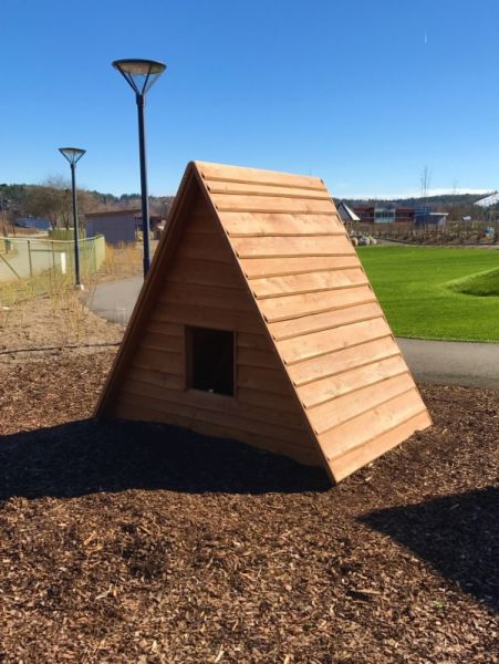 The Small House's wooden aesthetic beautifully complements any natural setting. Its presence on a playground, amidst the greenery of grass and trees, enhances the overall look, creating a cohesive and aesthetically pleasing play area. It blends seamlessly with other products from the Nature line, contributing to a unified and inviting playground landscape.