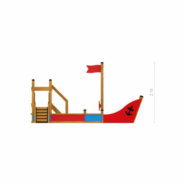 Every child can embrace their inner captain by taking the helm at the ship's red steering wheel, situated at the bow. Enhancing the realistic experience, the play structure is adorned with a red flag atop a wooden mast and an anchor at the bow.