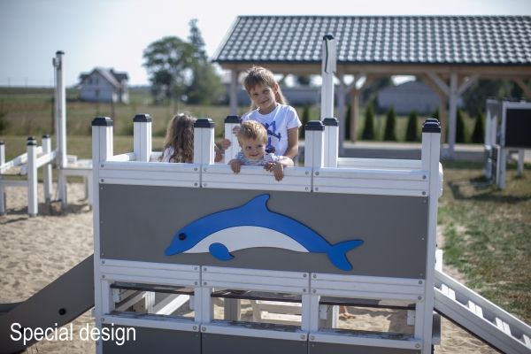 Adding to the playhouse's allure is its very own steering wheel and mast, transforming each play session into an incredible journey filled with unforgettable adventures. The Villa with Orca Single Playhouse is constructed from high-quality wood and features colorful elements that are resistant to external factors, ensuring that its eye-catching appearance remains vibrant and attractive over time.