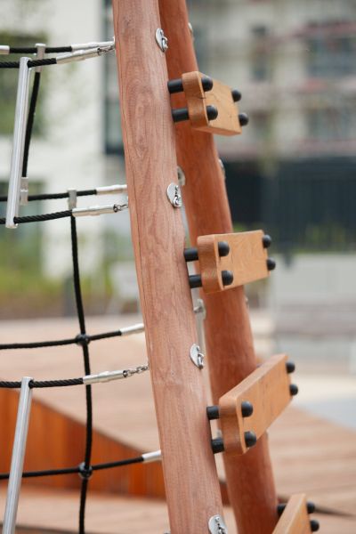 The Tipi I Climbing Net is robustly constructed from Robinia and Larch wood, which have been carefully treated and shaped to provide maximum comfort for children. Stainless steel and powder-coated steel elements are used to enhance the durability and longevity of the structure. The inclusion of reinforced Polypropylene (PP) ropes and an anti-slip, waterproof plywood provide additional safety features, making it ideal for children aged 3 and above.