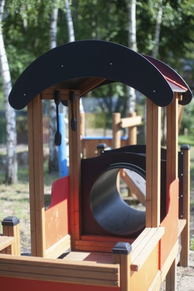 Access to the train's interior is made easy and safe with specially designed wooden ladders. Both the locomotive and the carriage are equipped with protective canopies, shielding young adventurers from excessive sunlight or adverse weather conditions.