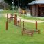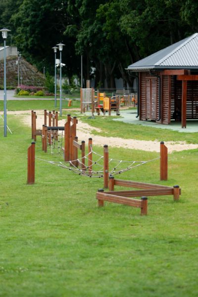 Constructed from durable Larch wood and powder-coated steel, the Trim Trail Line includes a variety of elements such as a wooden balance beam, climbing net, small steps for jumping, and ladders. Each component is thoughtfully designed to promote physical development, including balance, coordination, strength, and agility.