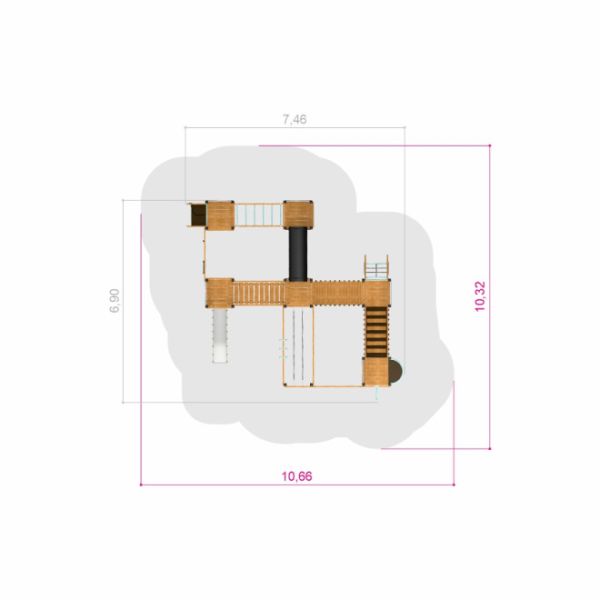 Boasting a generous width of 704 cm and length of 746 cm, the Tritowers Nature castle commands a significant presence. Its height reaches a robust 276 cm, drawing eyes upwards in admiration of its formidable structure. Safety is of prime importance with a critical falling height of 265 cm, and a wide safety zone that spans 1066 cm by 1112 cm. The setup requires a dedicated falling surface for added child protection, ensuring a secure play experience.