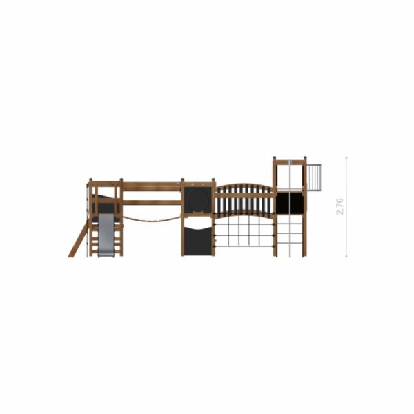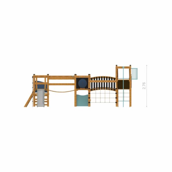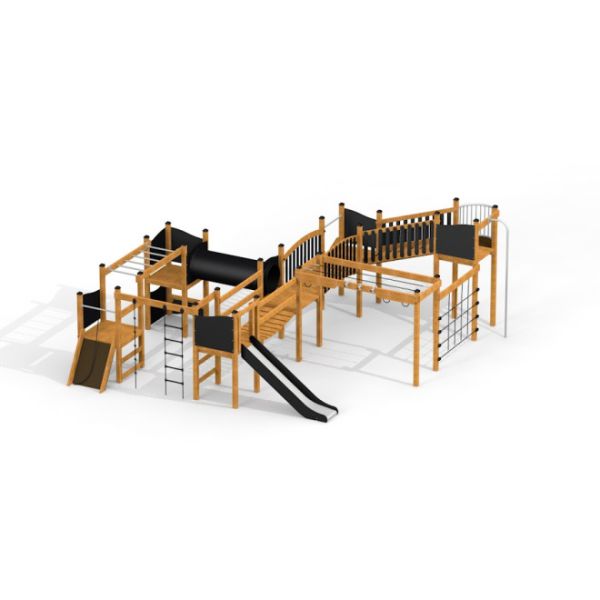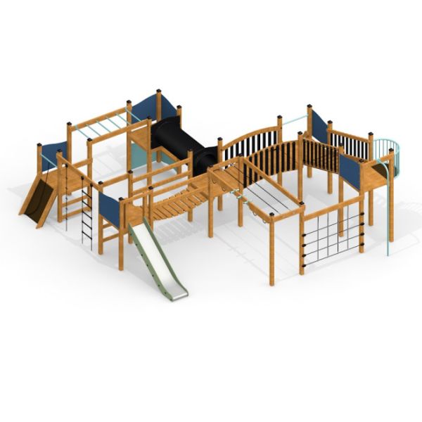 Modelled after historical fortifications, this castle with slide combines climbing and balancing elements to challenge and engage its young adventurers. Offering varying platform heights of 90 cm, 120 cm, and 180 cm, it features a range of activity zones designed to cater to different skill levels. Kids can test their agility on the hanging ladder, climb the inclined wall, navigate through the rope net, or traverse the horizontal ladder. The moving bridge adds a dash of thrill, while the tunnel fosters imaginative play. Various slides provide a swift and exciting descent, offering an exhilarating finale to the castle adventure.
