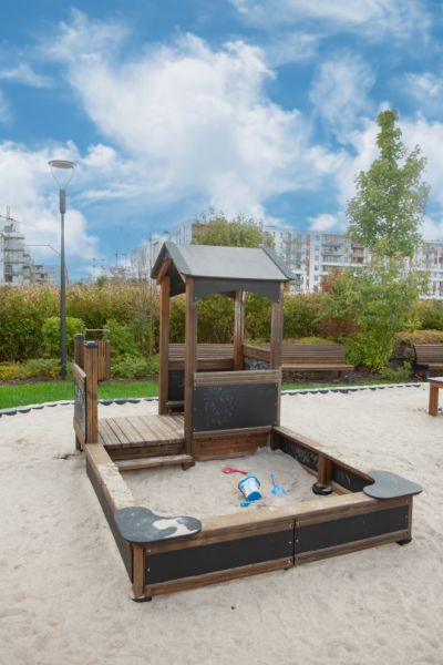 The wooden playhouse features carefully shaped wooden elements to provide maximum safety for children as they engage in various activities within its walls. The sandbox is equipped with cozy seats at each corner, providing a comfortable spot for both children and their parents to rest and interact. The playhouse's waterproof plywood roof shields its occupants from the sun, wind, and rain, making it an inviting haven for children to seek shelter and continue their playtime adventures.