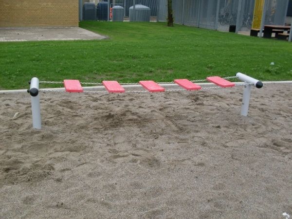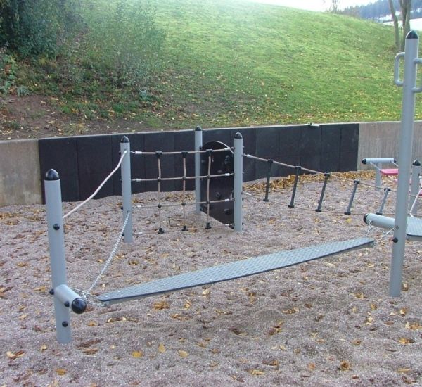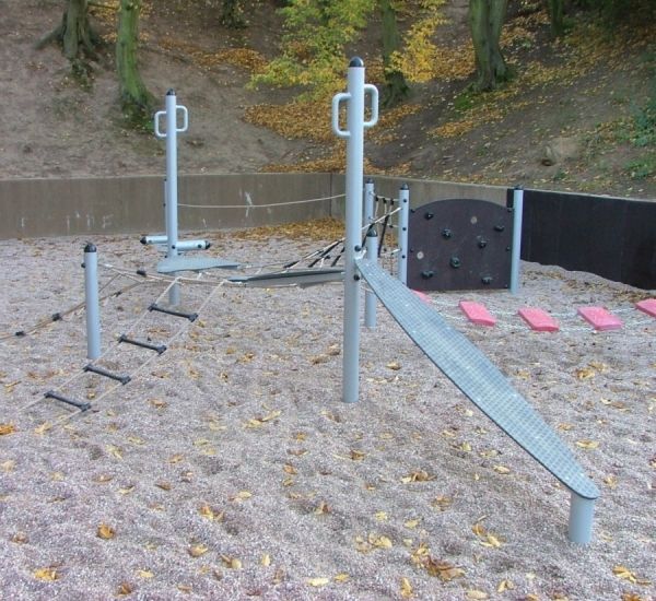 The materials used for this trail are robust and weather-resistant, including galvanized steel with anti-slip textures, reinforced polypropylene ropes, sturdy chains, and rubber elements. This ensures the longevity of the trail and keeps maintenance to a minimum, making it a sustainable choice for any community.
